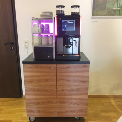 Gastrotheke mit Einbauten Rollbar, schwarz lackiert mit abschließbaren Türen mit oder ohne Tassenwärmer